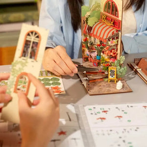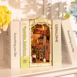 Bring a permanent bloom to your library with the Floral Corner DIY Book Nook Kit. This enchanting miniature diorama captures a sun-drenched European alleyway, anchored by a charming local flower shop. Designed to sit perfectly between your books, this kit invites you to step into a world of quiet beauty, where the scent of fresh petals and the warmth of a midday tea break are always just a glance away.