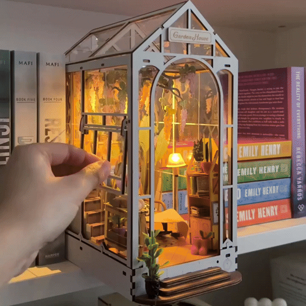This delightful Beginner-Friendly miniature kit invites you to build a peaceful indoor space, complete with hanging wisteria blossoms, lush potted plants, and a comfortable rattan chair. You'll bring to life miniature gardening tools, a small library, and even a ladder leading to a second-floor window.